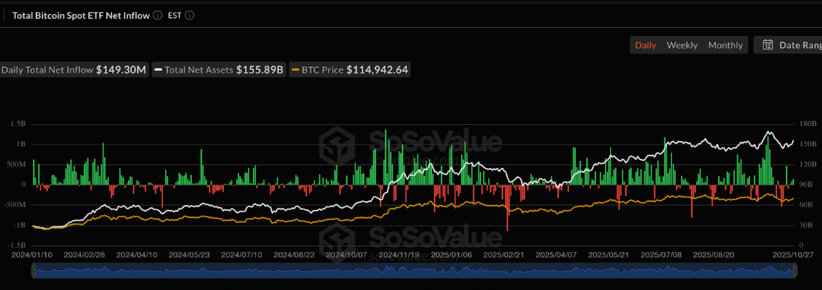 SoSoValue data shows that US spot Bitcoin ETFs recorded a net inflow of $149 million, indicating that investors were consistently showing interest in Bitcoin irrespective of the price fluctuations.