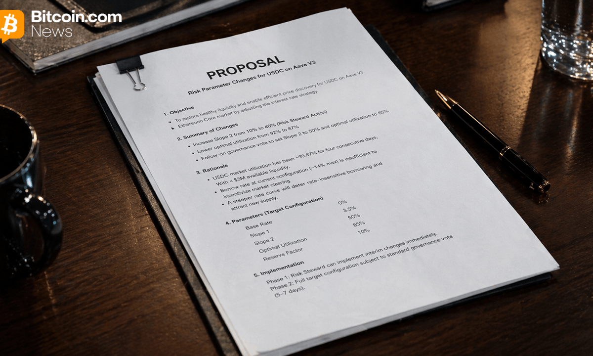 The proposal, filed as an Aave Request for Comment, asks Aave’s Risk Steward to immediately raise Slope 2 from 10% to 40% and lower optimal utilization from 92% to 87%. A follow-on governance vote would push Slope 2 to 50% and optimal utilization to 85%. At 100% utilization under the target configuration, USDC borrowers would face a maximum rate of approximately 53.5%, compared to the current ceiling of roughly 14%.