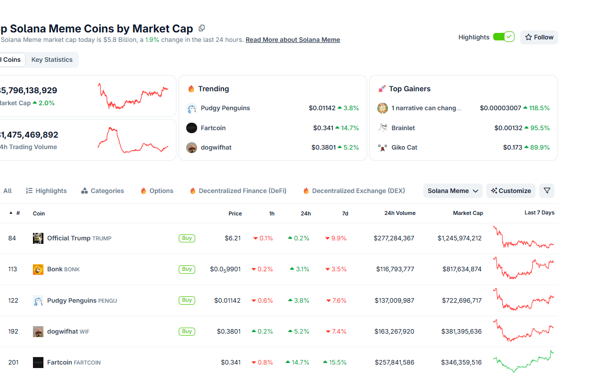 As Solana stabilizes, some of the top meme coins running on the modern chain are also firm. TRUMP crypto, Pengu, WIF, and Fartcoin are in the green. So far, the total market cap of Solana meme coins is up 2% to $5.7 billion.