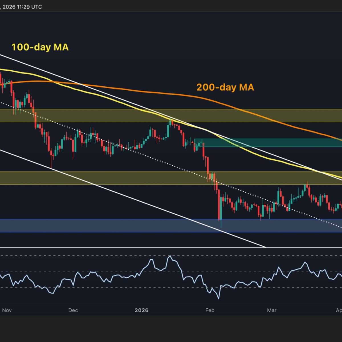 The next major test sits at the $85k–$90k zone, where the declining 200-day MA and a significant supply cluster converge. A weekly close above the $80k psychological level would be a structural development of real importance, as it confirms that the correction’s dominant trend has broken down. On the downside, the former channel boundary and 100-day MA near $75k are now the first support levels to defend on any pullback.